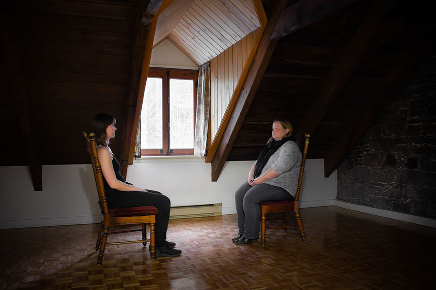 Rencontres silencieuses 2019-2020 Montréal (lieux divers) Le silence est cette chose étrange, il me semble, qu’on rencontre entre deux personnes qui se sont tout dit ou rien encore, unies dans l’intimité ou séparées par son absence, tels deux inconnus. Sans un mot, toutefois, la rencontre est-elle possible? L'intimité? Ce projet, débuté en 2019, met en contact différents groupes de deux inconnus qui ne se côtoieront jamais que dans le silence. Ces rendez-vous, organisés sur une base récurrente et pour une période indéterminée (de quelques semaines à plusieurs années), visent à explorer le type de relations qui peuvent être établies entre deux individus par leur seule présence, dans le court, le moyen ou le long terme, sans l’usage de la parole.